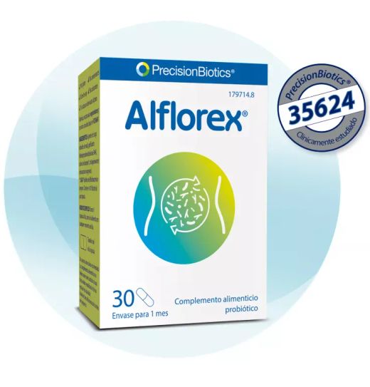Alflorex® es un complemento alimenticio con la cepa 35624® de Bifidobacterium longum, una cepa probiótica exclusiva y con características únicas (cepa PrecisionBiotics®), naturalmente abundante en el intestino humano. Esta cepa fue aislada, seleccionada y estudiada en ensayos clínicos por científicos y gastroenterólogos de primera línea de una de las instituciones más importantes del mundo en la investigación del microbioma para el manejo de los síntomas del colon irritable. Contribuye a mantener el equilibrio de la microbiota, preservando la función fisiológica de barrera intestinal y ayudando a reducir los síntomas gastrointestinales asociados al colon irritable (dolor abdominal, flatulencia, hinchazón, diarrea y/o estreñimiento,) gracias a las bacterias probióticas Bifidobacterium longum 35624® contenidas en su formulación. Cada cápsula de Alflorex® contiene alrededor de mil millones de bacterias vivas (1x109 bacterias) y mantiene una dosis apropiada a lo largo de la vida útil del producto, con un correcto almacenamiento.