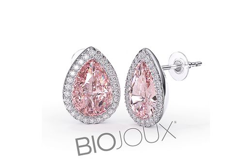 Pendientes Biojoux BJT301 con diseño en forma de lágrima, piedra central en color rosa rodeada de circonitas transparentes. Fabricados en acero quirúrgico 316L, son hipoalergénicos y seguros para pieles sensibles.