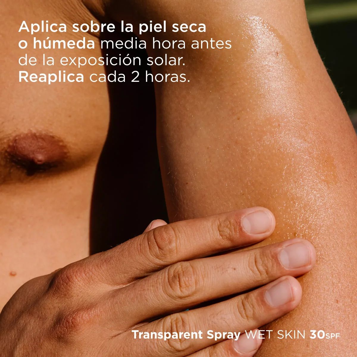 Fotoprotección invisible y ligera para piel mojada. Fotoprotector corporal en spray transparente, fresco y de secado inmediato. Resistente al agua. Permite su aplicación en cualquier dirección. Apto para todo tipo de pieles, incluida piel sensible y/o atópica.