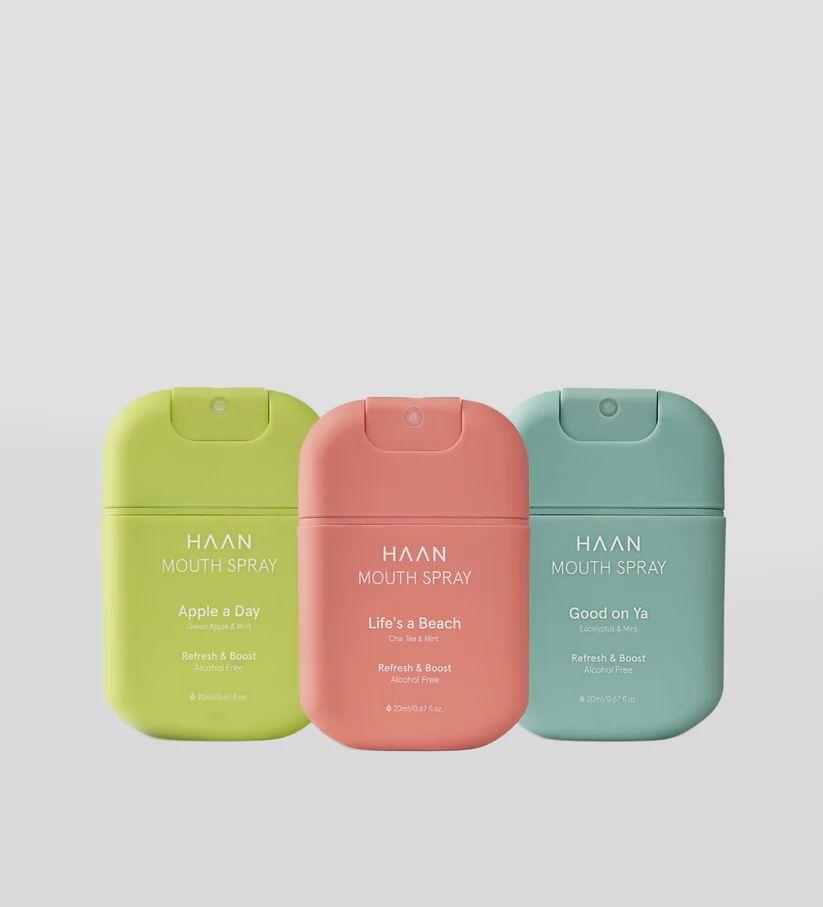Haan Mouth Spray es un spray bucal vegano, sin alcohol y con sabores irresistiblemente frescos que mejoran el aliento al instante y elevan tu estado de ánimo. Formulado con ingredientes naturales, limpia y refresca sin agredir la mucosa oral, ofreciendo una sensación de frescor duradera en cada pulverización. Perfecto para llevar siempre contigo y usar en cualquier momento del día, transforma tu rutina en un pequeño momento de cuidado y bienestar.