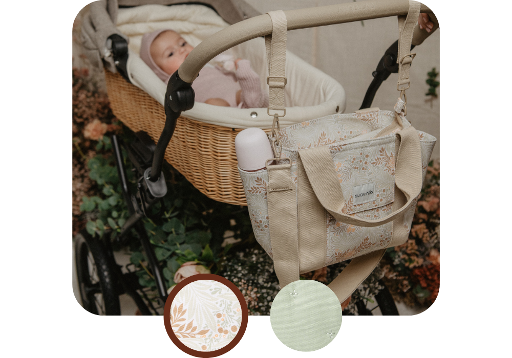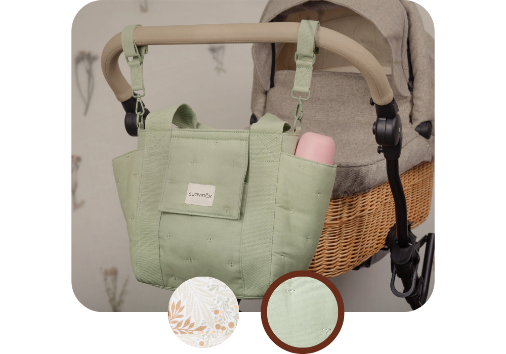 Práctico, bonito y funcional, este bolso de maternidad es perfecto para llevar todo lo que necesitas en tus paseos con el bebé. Cuenta con bolsillos interiores para tenerlo todo organizado, colgadores para sujetarlo fácilmente al manillar del carrito y tejido exterior resistente que evita que se cale. Disponible en dos diseños elegantes: verde liso o estampado floral. Además, incluye de regalo un biberón de 240 ml, un portachupetes y un broche de bolitas.