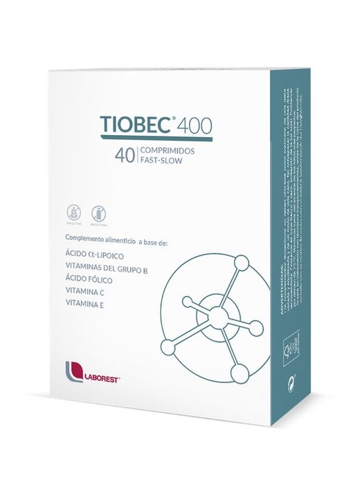 Tiobec® 400 es un complemento alimenticio formulado con Ácido α-Lipoico, Vitaminas del grupo B, Ácido fólico, Vitamina C y Vitamina E, ideal para complementar la dieta diaria en situaciones donde sea necesario. El Ácido α-Lipoico actúa como antioxidante y coenzima en el metabolismo celular, favoreciendo la producción de energía. Las Vitaminas C y E ayudan a proteger las células frente al estrés oxidativo, mientras que las Vitaminas B1, B2, B6 y B12 contribuyen al funcionamiento normal del sistema nervioso. Este producto es libre de gluten, lactosa y doping, con 40 comprimidos de liberación rápida y lenta.