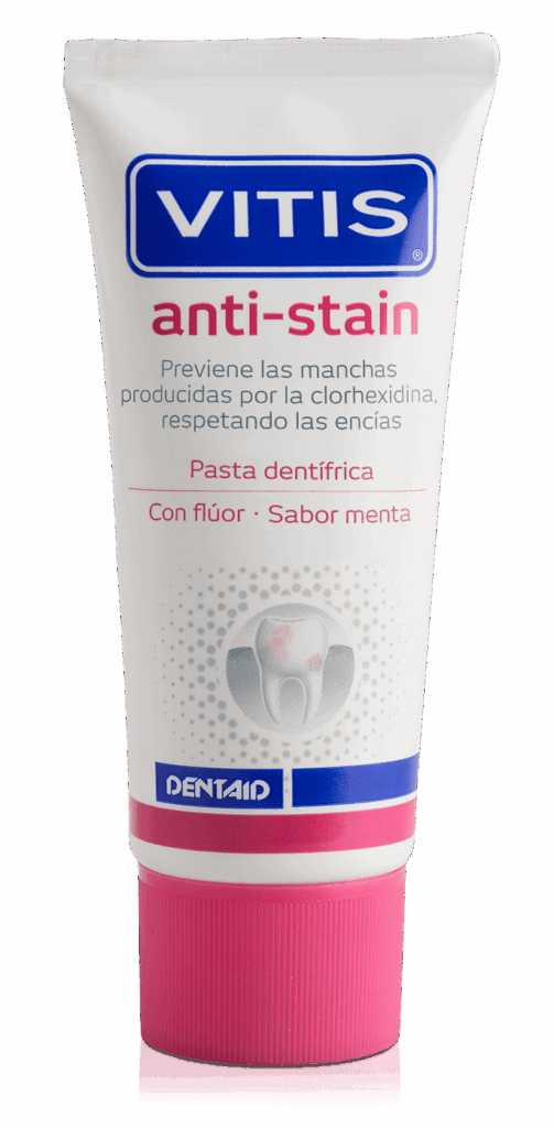 Vitis® anti-stain es una pasta dentífrica especialmente indicada para prevenir la aparición de manchas dentales asociadas al uso de clorhexidina, un antiséptico bucal común en tratamientos periodontales, cirugías bucales e implantes. Gracias a sus activos como la polivinilpirrolidona o el doble sistema de fosfatos, consigue prevenir y reducir hasta un 86% las manchas por clorhexidina con un uso preventivo diario.
